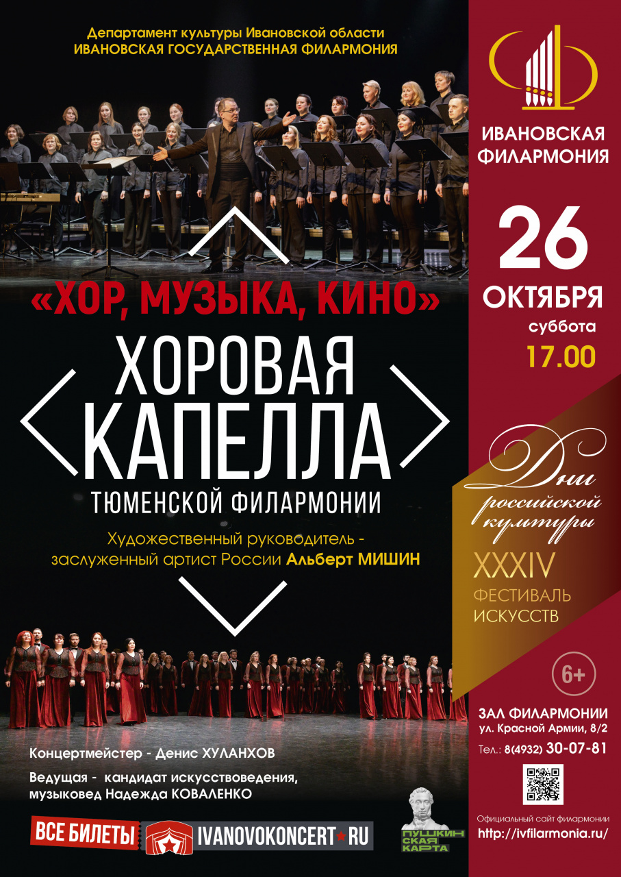 26 октября в 17-00 в рамках XXXIV фестиваля искусств «Дни российской культуры» Ивановская государственная филармония приглашает на программу «Хор, музыка, кино» в исполнении Хоровой капеллы Тюменской филармонии.