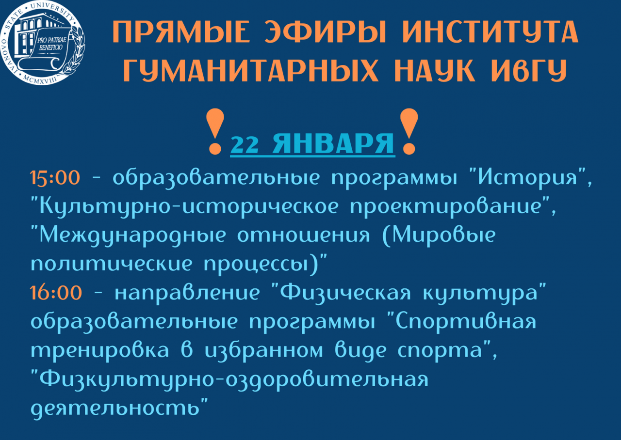 21 и 22 января в официальной группе университета ВКонтакте состоятся прямые эфиры для абитуриентов по образовательным программам Института гуманитарных наук ИвГУ.