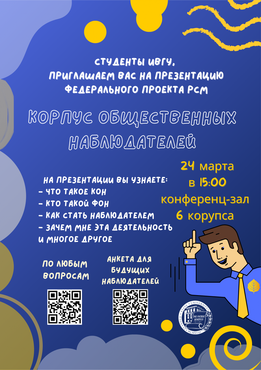 24 марта в 15:00 в конференц-зале 6-го корпуса Ивановского государственного университета состоится встреча регионального координатора Корпуса общественных наблюдателей (КОН) Российского союза молодежи по Ивановской области Найдича Артема Юрьевича со студентами нашего университета.
