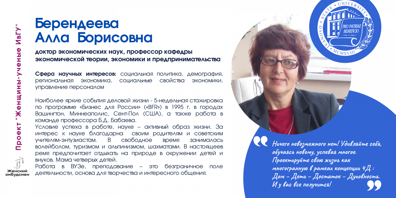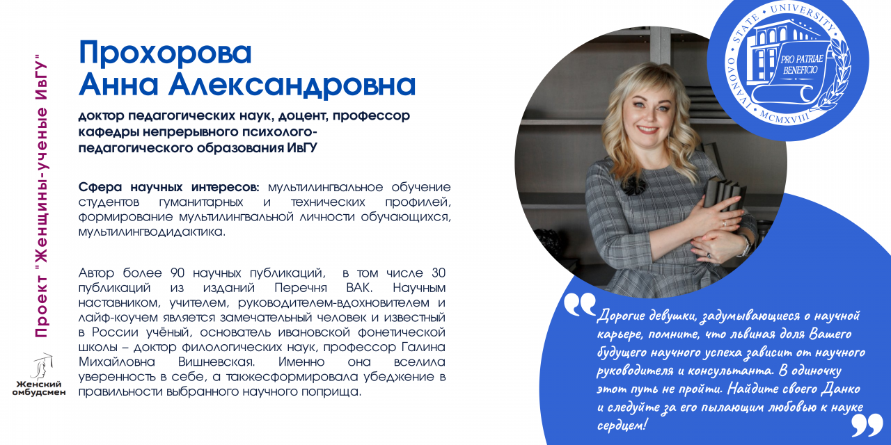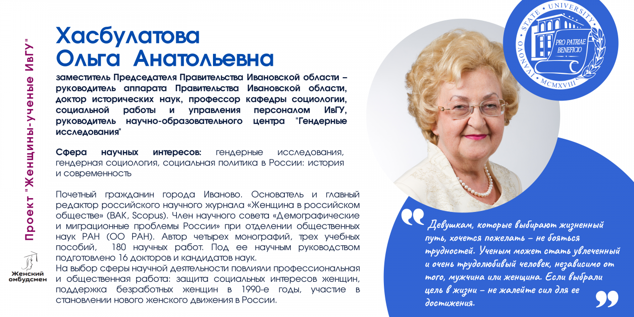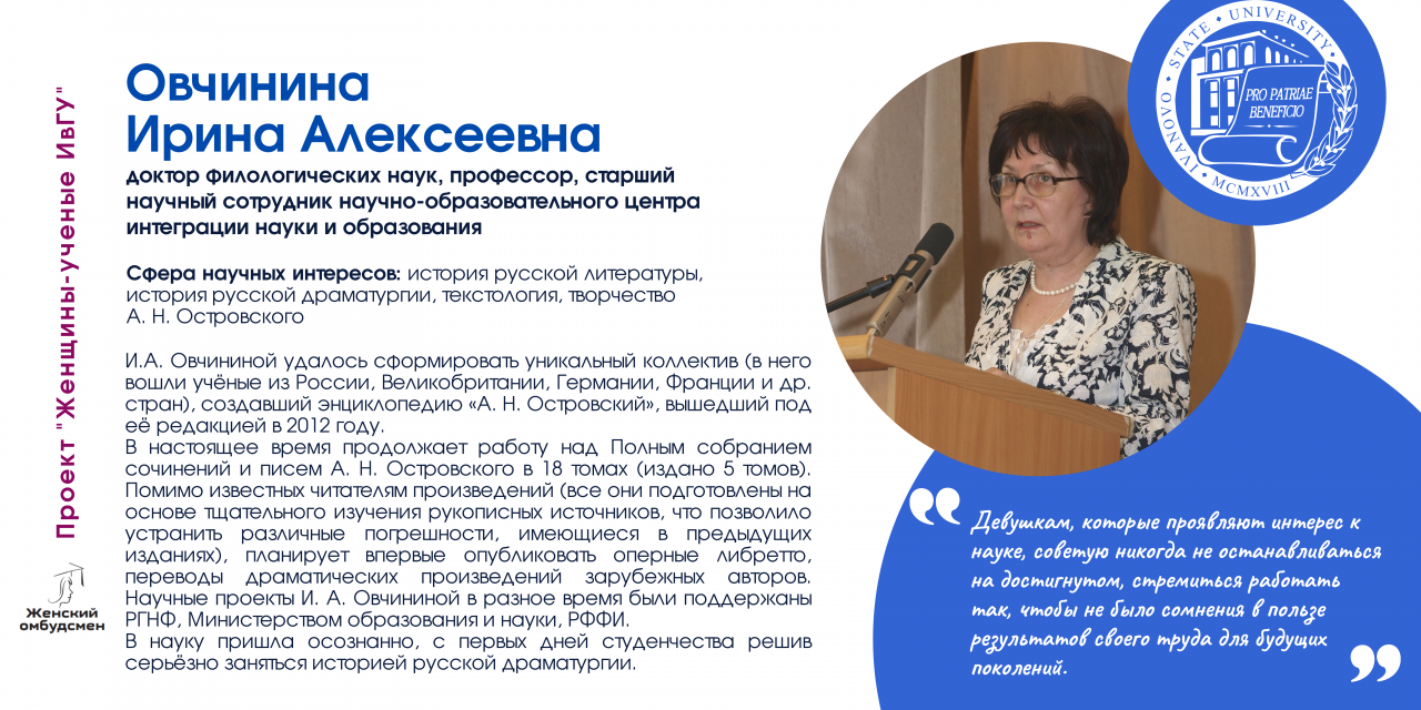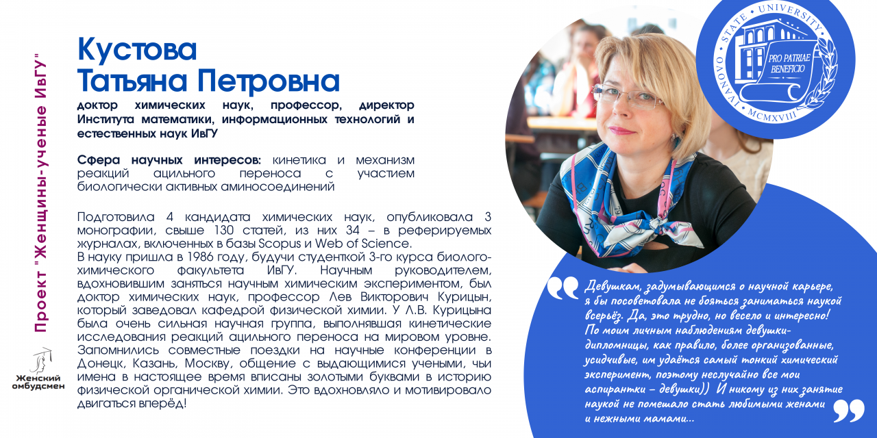 В Ивановском государственном университете работают 170 женщин-ученых, в том числе 26 докторов и 112 кандидатов наук. В последнее время увеличилось число молодых исследовательниц (47 чел.).
