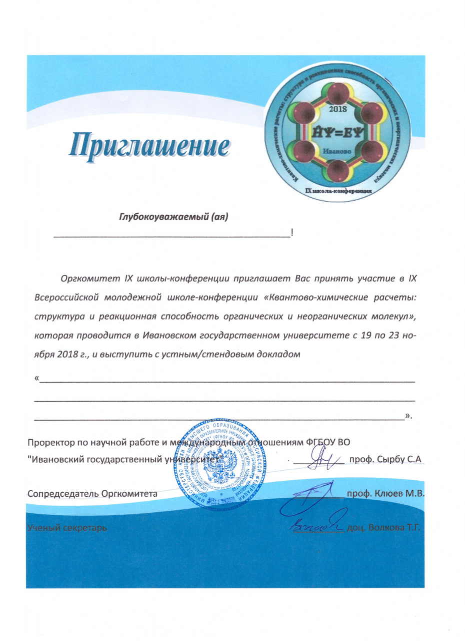 Приглашаем вас принять участие в работе IX Всероссийской школы-конференции «Квантово-химические расчеты: структура и реакционная способность органических и неорганических молекул», которая состоится в ноябре 2018 г. в г. Иваново. Научная программа школы предполагает пленарные лекции ведущих ученых, устные доклады молодых участников, стендовую сессию, дискуссии и консультации по тематике школы. В 2018 г. школа-конференция посвящена особой юбилейной дате – 100-летию Константина Соломоновича Краснова.