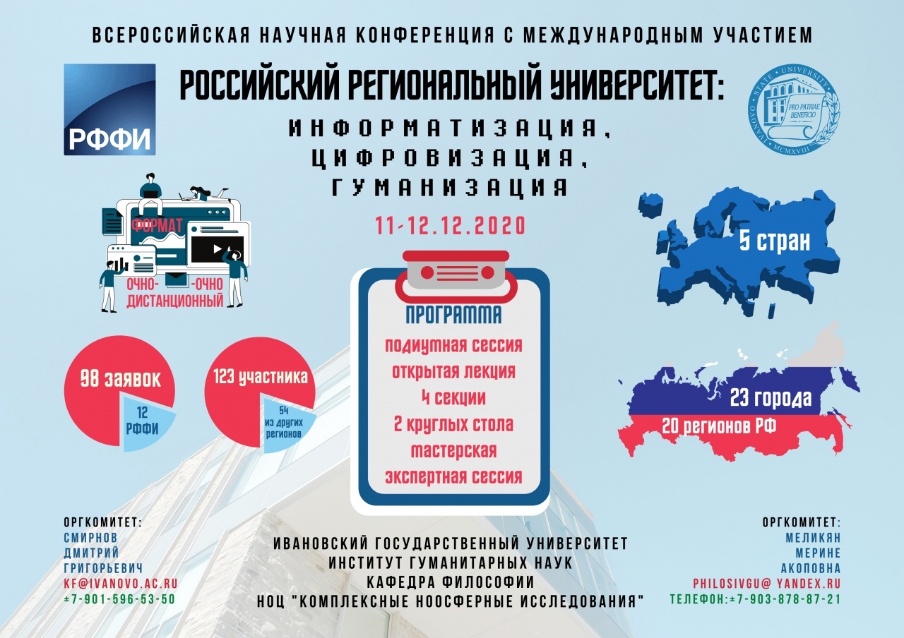 11–12 декабря 2020 года на базе Ивановского государственного университета при финансовой поддержке РФФИ (Российского фонда фундаментальных исследований) пройдет Всероссийская научная конференция с международным участием «Российский региональный университет: информатизация, цифровизация, гуманизация». Пандемия COVID-19 внесла коррективы в планы оргкомитета: к очному формату проведения конференции добавился дистанционный (с использованием internet-платформ) для участников, относящихся к группам риска, и лиц 65 и старше. Участников, не подпадающих под ограничения, ждем в стенах Ивановского государственного университета.