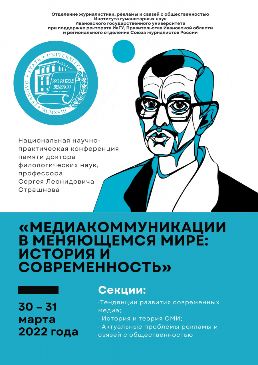 Отделение журналистики, рекламы и связей с общественностью Института гуманитарных наук Ивановского государственного университета при поддержке ректората ИвГУ, Правительства Ивановской области и регионального отделения Союза журналистов России 30–31 марта 2022 года проводит Национальную научно-практическую конференцию памяти доктора филологических наук, профессора Сергея Леонидовича Страшнова «Медиакоммуникации в меняющемся мире: история и современность».
