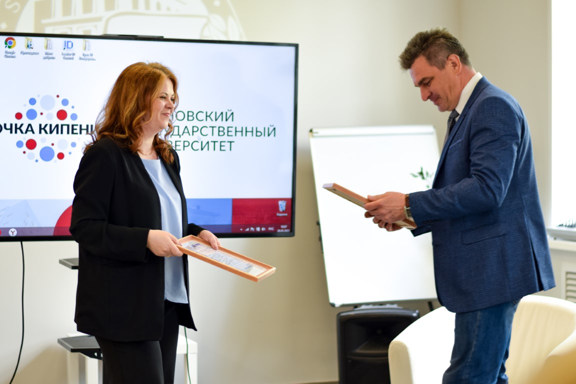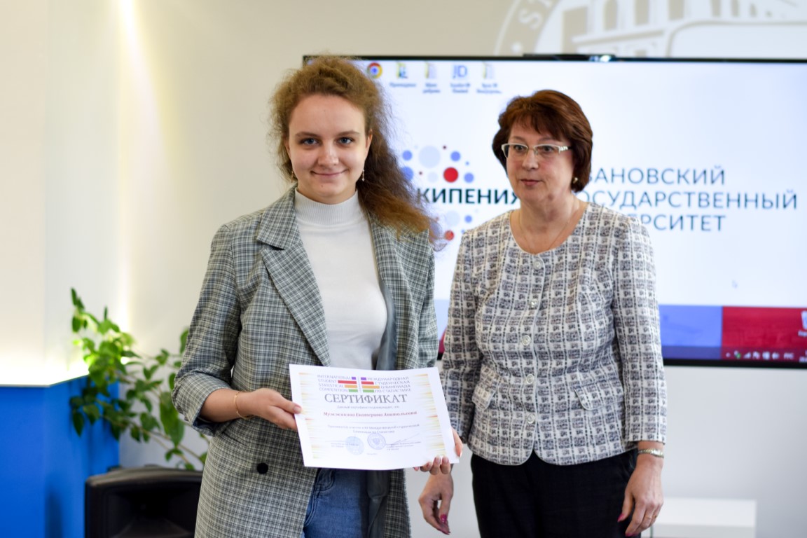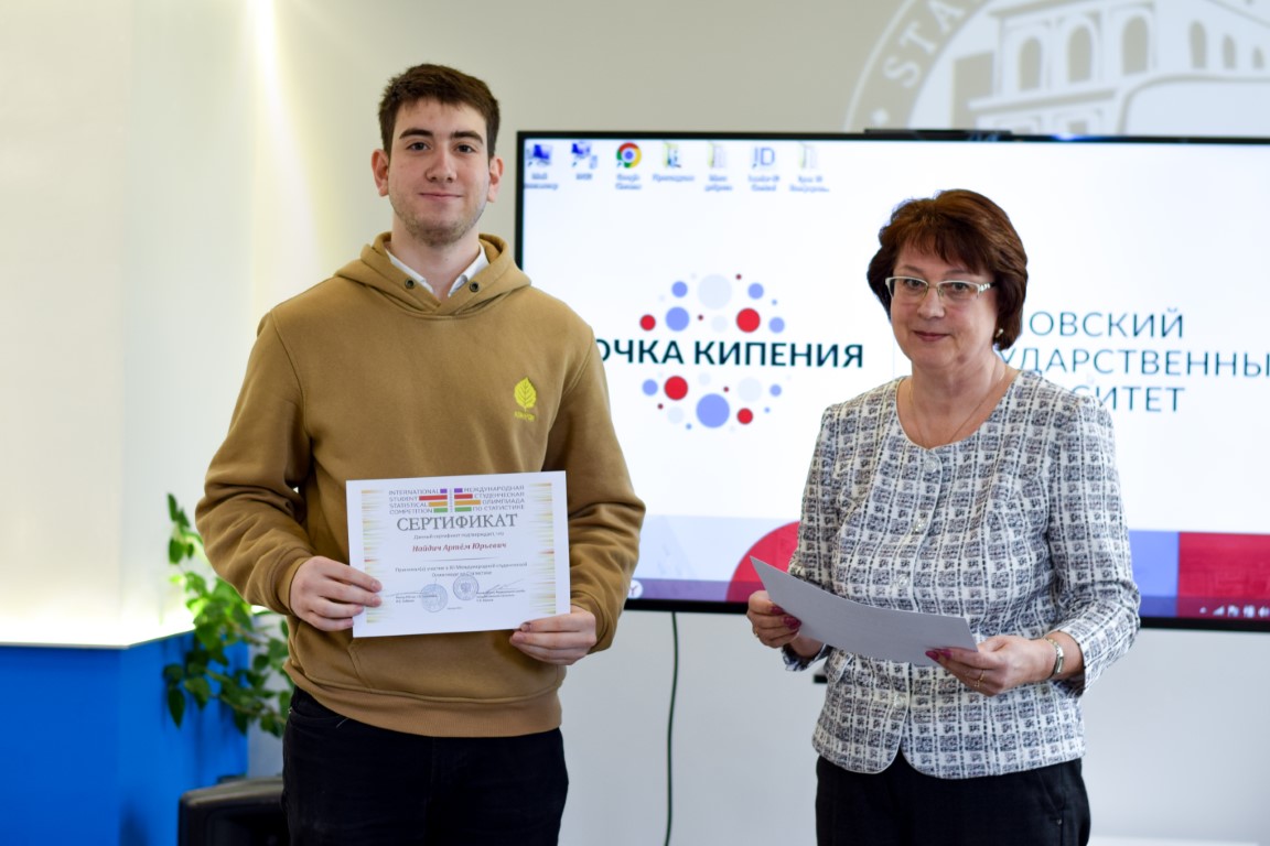О.В. Гусева в свою очередь вручила Благодарность на имя ректора ИвГУ, поблагодарила коллектив университета за давнее взаимодействие и отметила важность подписания совместной «дорожной карты» на уровне Росстата. Также она наградила Сертификатами участников XII Международной студенческой олимпиады по статистике, активных студентов ИвГУ – Артема Юрьевича Найдича, Александра Николаевича Носова и Екатерину Анатольевну Мужжакову. Напомним, награждение авторов лучших докладов региональной конференции дипломами, подписанными ректорами всех вузов региона, пройдет 23 мая в 14:00 на закрытии конференции в Музейно-выставочном центре (ИГИКМ им. Д.Г. Бурылина).