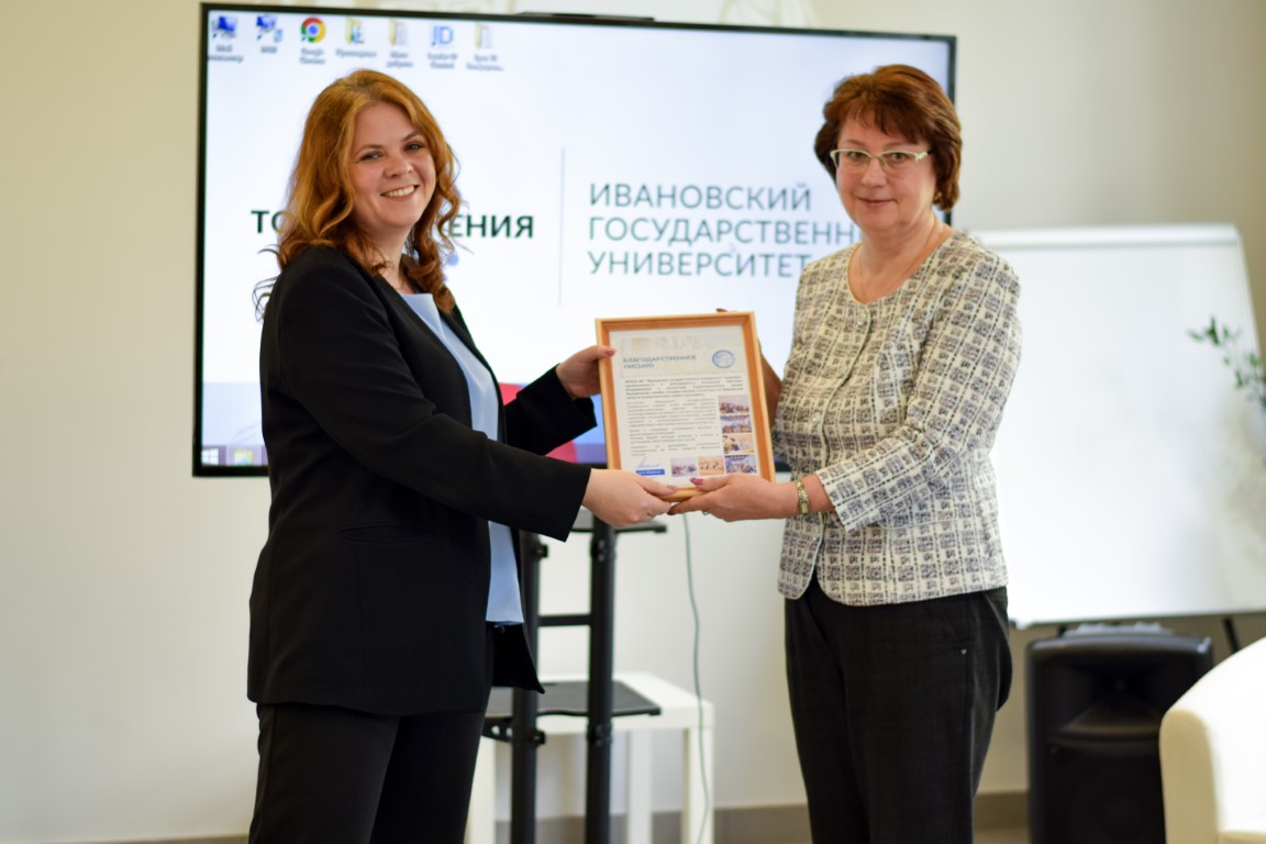 Также И.Н. Смирнова вручила Благодарственные письма гостям мероприятия: заместителю управляющего Отделением по Ивановской области ГУ Банка России по ЦФО Соколову Михаилу Николаевичу и заместителю руководителя Территориального органа Федеральной службы государственной статистики по Ивановской области Гусевой Ольге Владимировне.