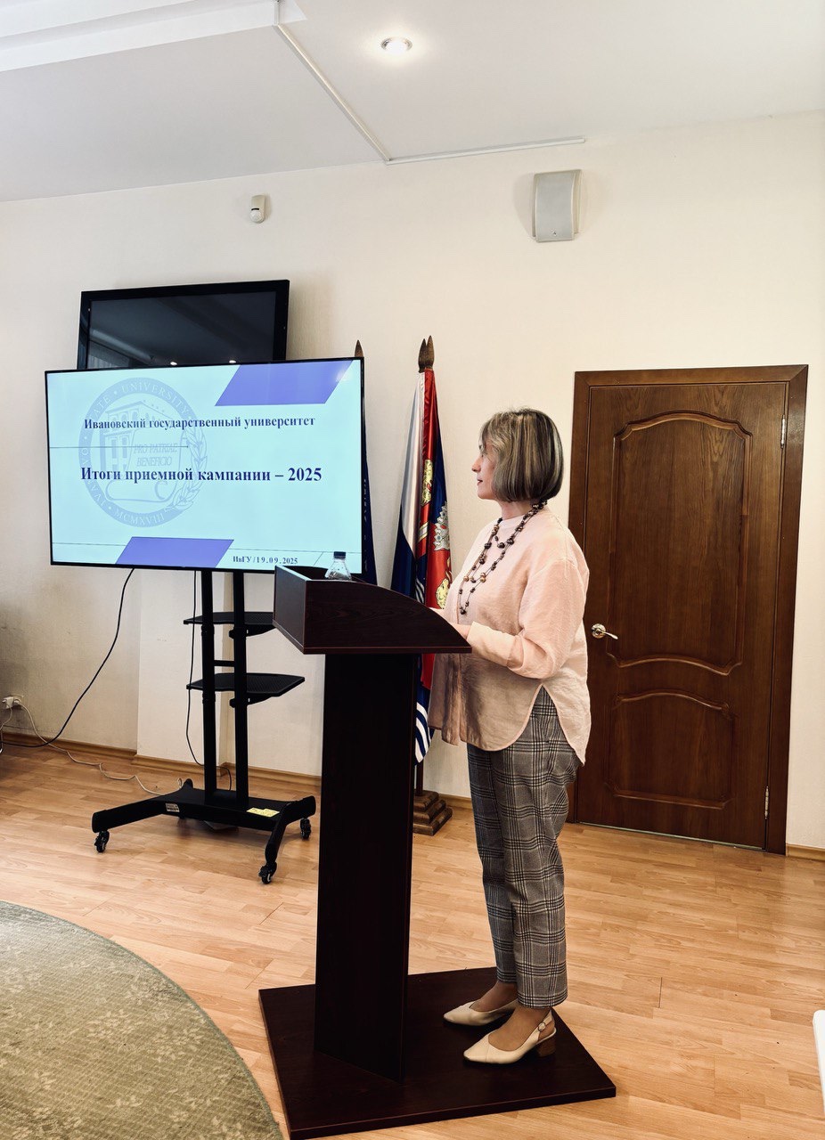 В ключевом докладе ответственного секретаря приемной комиссии Светланы Езерской и начальника отдела подготовки научно-педагогических кадров высшей квалификации Ирины Будановой были отражены основные результаты приемной кампании 2025 года и динамика количества зачисленных в головной вуз и Шуйский филиал ИвГУ за последние пять лет. Ректор ИвГУ Алексей Малыгин отметил, что по сравнению с прошлым годом значительно увеличилось количество зачисленных в рамках целевой и отдельной квот.