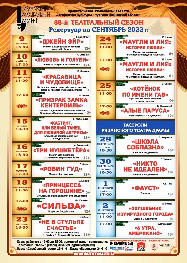 Наш партнер, Ивановский музыкальный театр, приглашает членов профсоюза и членов их семей 9 сентября в 18.30 на открытие 88-го театрального сезона с просмотром мюзикла «Джейн Эйр». Цена билета для друзей театра 300 руб. (13-й, 14-й ряды). Заказать билеты можно в обкоме профсоюза образования.
