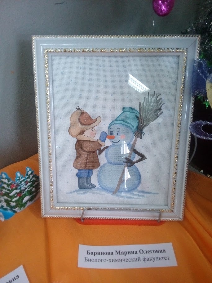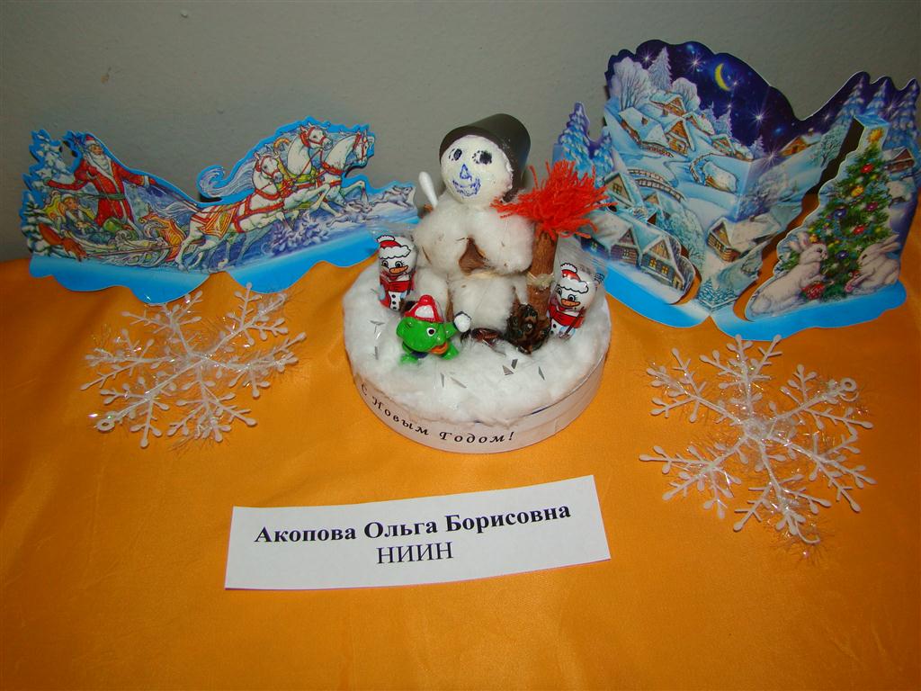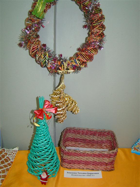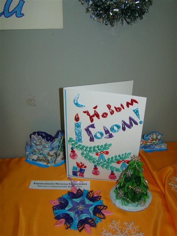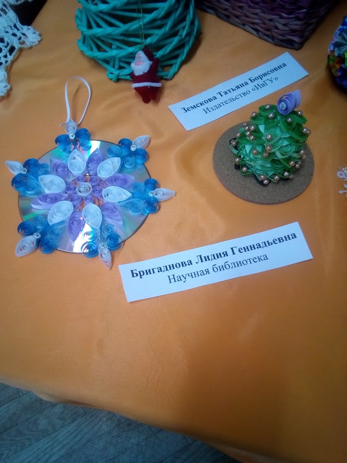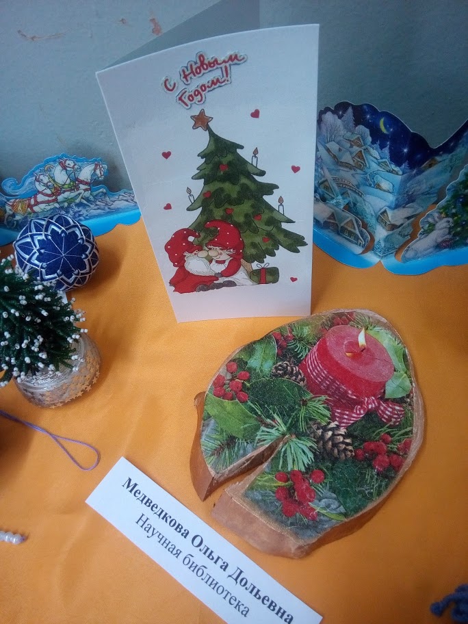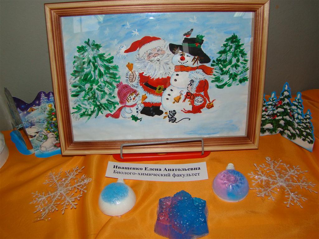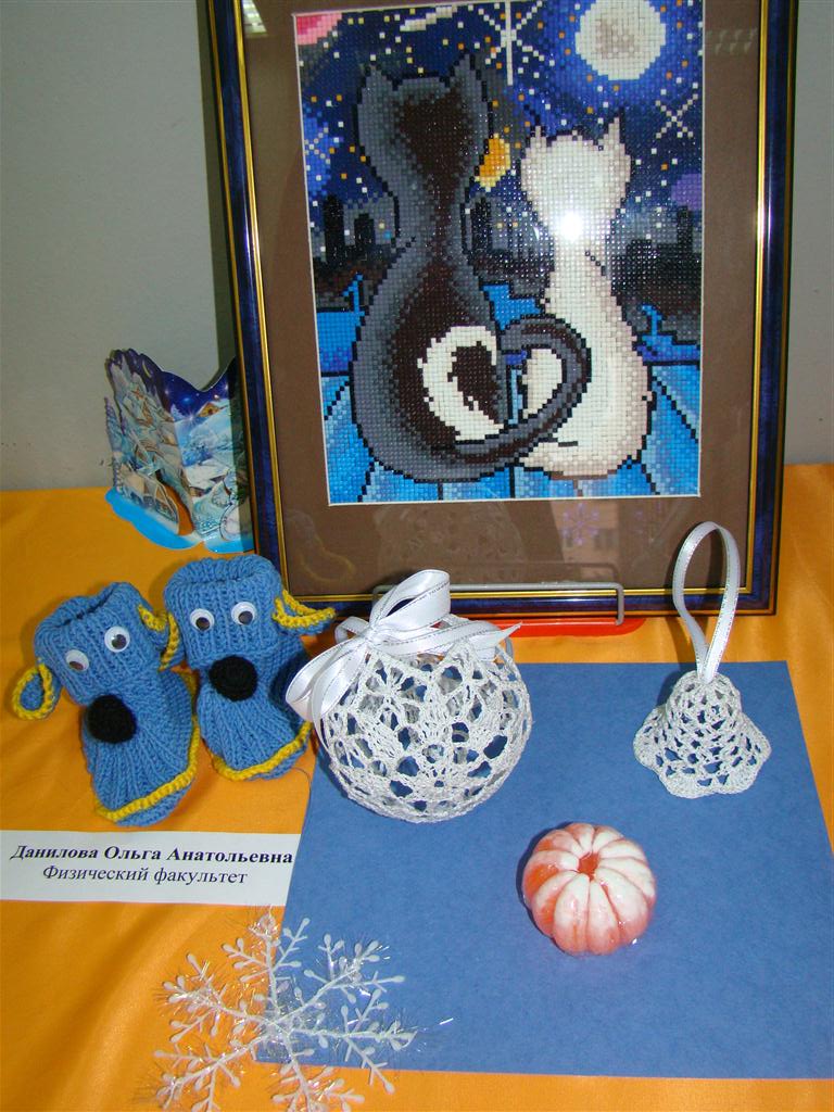 На фотографиях представлены работы участников. Здесь можно увидеть алмазную мозаику (работу представила О.А. Данилова), вышивку (М.О. Баринова), рисунок акварелью (Е.А. Иващенко), работы в технике де купаж (О.Д. Медведкова), оригами (Т.М. Прыгунова), квиллинг (Л.Г. Бригаднова, Н.К. Кормилицына), вязаные работы (М.Ю. Глушкова, Л.Е. Смирнова), поделки из газетного жгута (Т.Б. Земскова), из бисера (Е.А. Катреча), из дерева (Е.Ю. Волкова), игрушки из ткани (Т.В. Кузнецова), объемные новогодние композиции (О.Б. Акопова, А.И. Смирнова, И.В. Сенюшкина), открытки с фотоколлажем (Н.В. Бумбина), декоративное мыло и другие разнообразные работы. Все они свидетельствуют о высоком творческом потенциале участников.