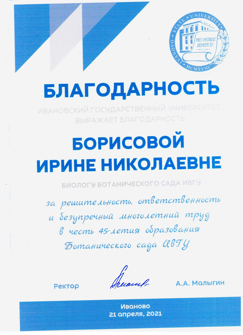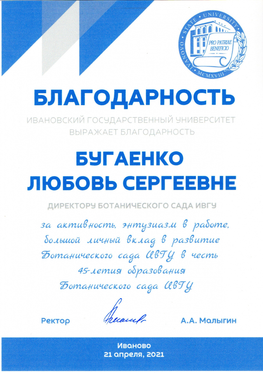 Ботанический сад ИвГУ – место особое, наполненное радостным созидательным трудом, жизнью и светом, «святое», как выразилась внучатая племянница А.К. Малиновского Александра Анатольевна Луканина. Не случайно С.А. Потапова, поздравляя коллектив работников Ботанического сада с юбилеем, отметила, что о нем знают не только на территории России, но и в странах СНГ, а О.И. Кравченко, поблагодарив сотрудников Ботанического сада за участие в создании семи брошюр по ведению Красной книги Ивановской области, напомнила, что сад – это место и научных исследований, и многогранной просветительской деятельности. Ректор ИвГУ Алексей Александрович Малыгин, обращаясь к присутствовавшим, подчеркнул, что «мы обязаны сохранить все то, что здесь есть, и сделать сад интересным для студентов нашего вуза и гостей».