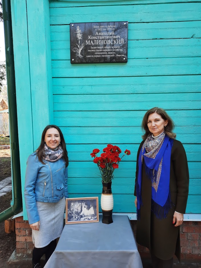 22 апреля праздничные мероприятия продолжились на базе Ботанического сада ИвГУ. Участники конференции собрались на торжественное открытие мемориальной доски Малиновскому А.К. – талантливому ученому, селекционеру, одному из первых озеленителей города Иваново. С 1934 г. Анатолий Константинович был управляющим вновь организованного ивановского городского треста зеленого строительства, третья бригада которого базировалась на территории современного Ботанического сада ИвГУ. Малиновский А.К. заботился не только о дендрарии и цветочном хозяйстве, но и о парке имени Революции 1905 года. Во время Великой Отечественной Войны (1941–1945 гг.) ему удалось убедить командование воинской части прекратить валку деревьев на территории парка. Анатолий Константинович собрал уникальную коллекцию деревьев, кустарников и многолетних травянистых растений; им было выведено более 30 сортов декоративных растений (чубушник, флоксы, георгины, люпины и др.).