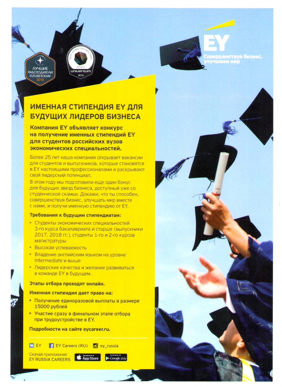 Компания EY, международный лидер в области аудита, консультирования, налогообложения и консультационного сопровождения сделок, объявляет о старте конкурса на получение именных стипендий для студентов экономических специальностей.