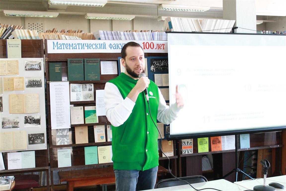 По инициативе центра «Карьера» в рамках университетского проекта «С места – в карьеру!» 11 апреля 2018 года в читальном зале прошел очередной мастер-класс для студентов ИвГУ «16 вредных советов для Вашего резюме» (от старшего специалиста по подбору персонала Северо-Западного филиала ПАО «МегаФон» Кирилла Мазуренко). Также в мастер-классе приняли участие представители Ивановского филиала ПАО «МегаФон».