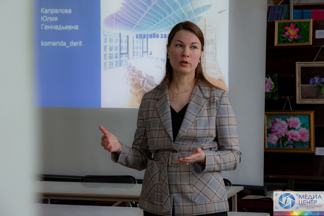 Также одним из первых мероприятий этой недели стала прошедшая в читальном зале 1-го корпуса встреча с заместителем директора Департамента экономического развития и торговли Ивановской области Юлией Геннадьевной Капраловой. В начале своего выступления Юлия Геннадьевна рассказала о руководящем составе департамента, а также о том, что студенты направления «Экономика» проходят там практику и могут устроиться на работу без конкурса. В процессе диалога были подняты вопросы о нюансах трудоустройства и размере заработной платы. Студенты получили очень важную информацию о том, что они могут зарегистрировать себя как самозанятые и получать стаж, который поспособствует дальнейшему карьерному продвижению. Ю.Г. Капралова рассказала студентам о важности написания правильного резюме. Она отметила, что резюме должно быть красочным и максимально раскрывать личность.