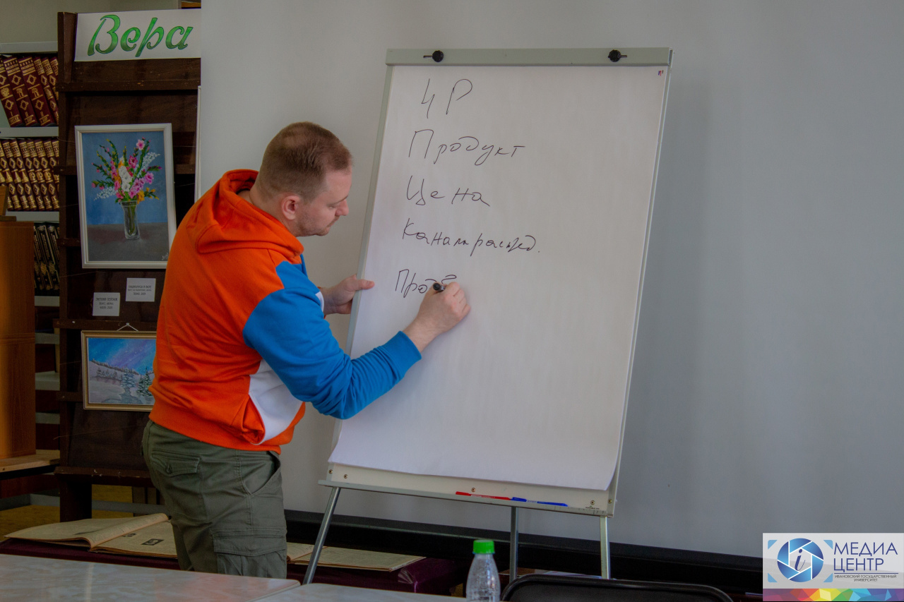 А.Е. Кирьянов 24 марта провел и свое мероприятие – тренинг для студентов старших курсов «Анализ специалиста через призму концепции Маркетинг-микс». Алексей Евгеньевич рассказал студентам об одной из самых известных и популярных концепций маркетинга – концепции «4p» (пи), объединяющей такие элементы, как продукт (product), цена (price), канал распределения (place), продвижение (promotion). Все эти элементы необходимо учитывать при составлении маркетингового плана компании.