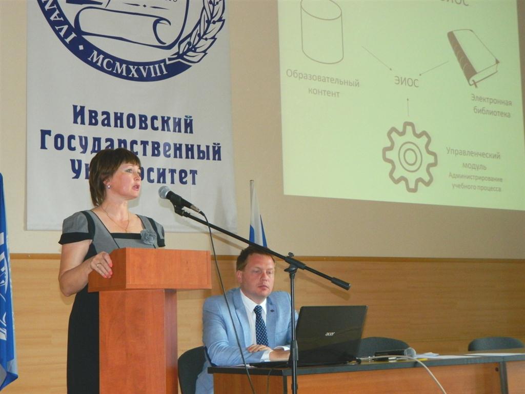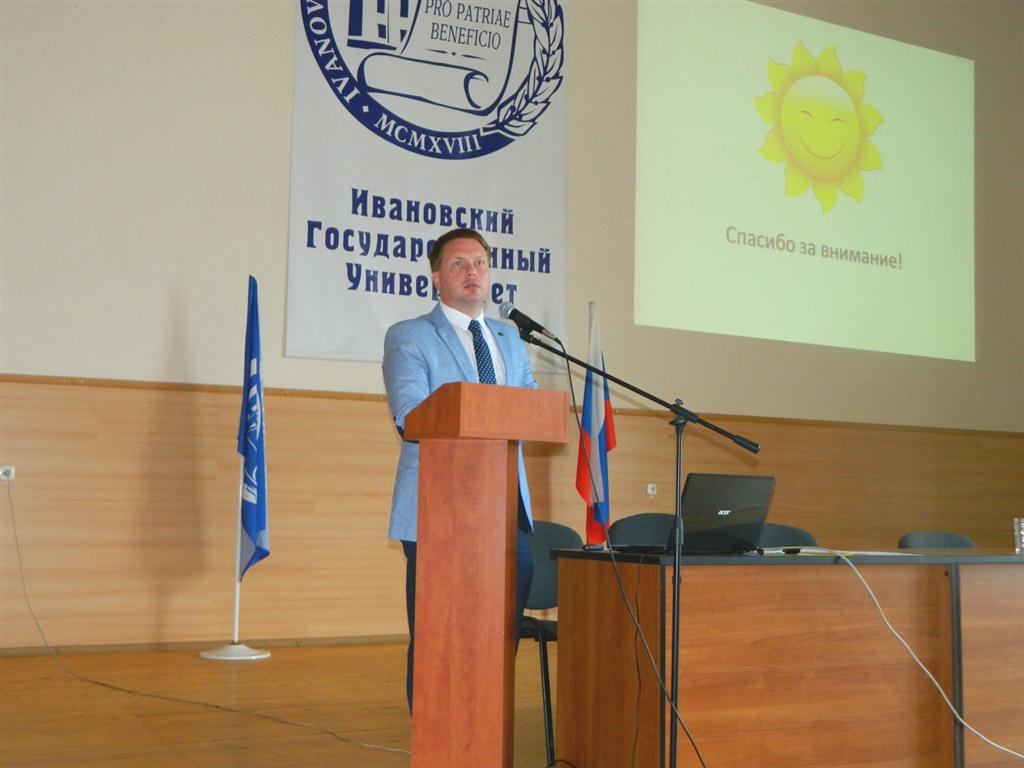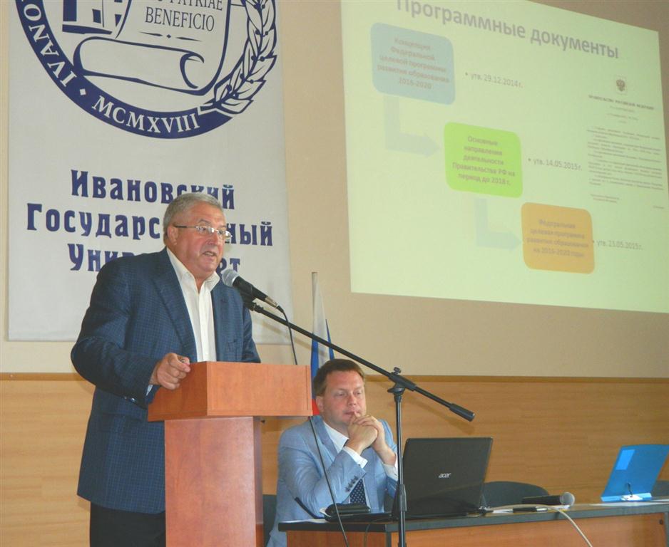 Первый проректор В. И. Назаров в своем докладе «Классический университет в современных реалиях» обозначил концепции федеральной целевой программы развития образования с 2016-2020 г.г., цели и задачи ФЦПРО, а также роль и место ИвГУ в указанных мероприятиях в контексте государственного задания на подготовку кадров.