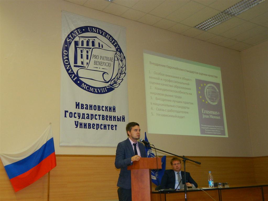 - О стандартах обеспечения гарантий качества высшего образования. Выступающие – О.Л. Ксенофонтова, начальник отдела мониторинга и оценки качества образования; Н.Д. Сорокин, начальник управления коммерческого образования университета, сообщили о политике ИвГУ при обеспечении гарантий качества образования в вузе, о необходимости формирования системы внутреннего мониторинга и внешней оценки образовательных программ. Особое внимание присутствующих коллеги обратили на значимость более активного участия работодателей при разработке и утверждении образовательных программ, на соответствие программ профессиональным стандартам, а также на создание условий для активного участия студентов в своем образовании.